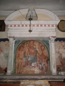 La piccola sala interna dell’Oratorio presenta un altare su cui è posta un’edicola formata da colonnine e timpano semicircolare. La statua della Madonna collocata sull’altare, nasconde in parte l’antichissimo affresco sul muro di fondo riproducente la Madonna delle Grazie seduta in trono con Gesù Bambino, fra i Santi Sebastiano e Rocco. La Vergine sorregge con la mano sinistra una mela che viene osservata con attenzione dal Bambino, raffigurato nudo in piedi sulle sue gambe. San Sebastiano sulla sinistra, ha il corpo trafitto dalle frecce, mentre San Rocco a destra col bastone del pellegrino, fa vedere la piaga della peste sulla gamba.