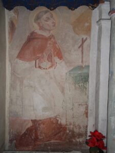 Ai lati dell’altare si trovano due affreschi, opera di autore ignoto, eseguiti nella seconda metà del XVII secolo. A sinistra, è dipinto S. Carlo Borromeo in preghiera, mentre a destra si può osservare una raffigurazione di Sant’Antonio col Bambino Gesù. Alla base dell’altare, all’interno di un ovale di stile barocco, si trova la figura di San Pietro che tiene in mano le chiavi della Chiesa.