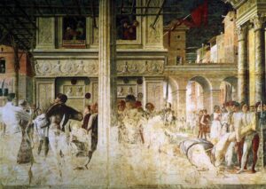 Antonio Ovetari dispose nel testamento di affrescare la cappella di famiglia presso la Chiesa degli Eremitani di Sant’ Agostino a Padova e l’incarico fu dato a  quattro pittori fra cui Andrea Mantegna, nato ad Isola di Carturo, distante solo pochi chilometri dall’Oratorio. Si può quindi ipotizzare che la famiglia Ovetari avesse in precedenza commissionato all’artista, all’epoca tredicenne, la decorazione dell’Oratorio di Santa Maria delle Grazie. Le imprecisioni nelle proporzioni dei corpi dei personaggi rappresentati sull’affresco, rivelano un autore ancora giovane e non pienamente formato, anche se si notano alcuni particolari precisi e raffinati tipici dell’arte classica soprattutto nell’esecuzione del trono.